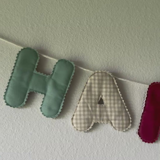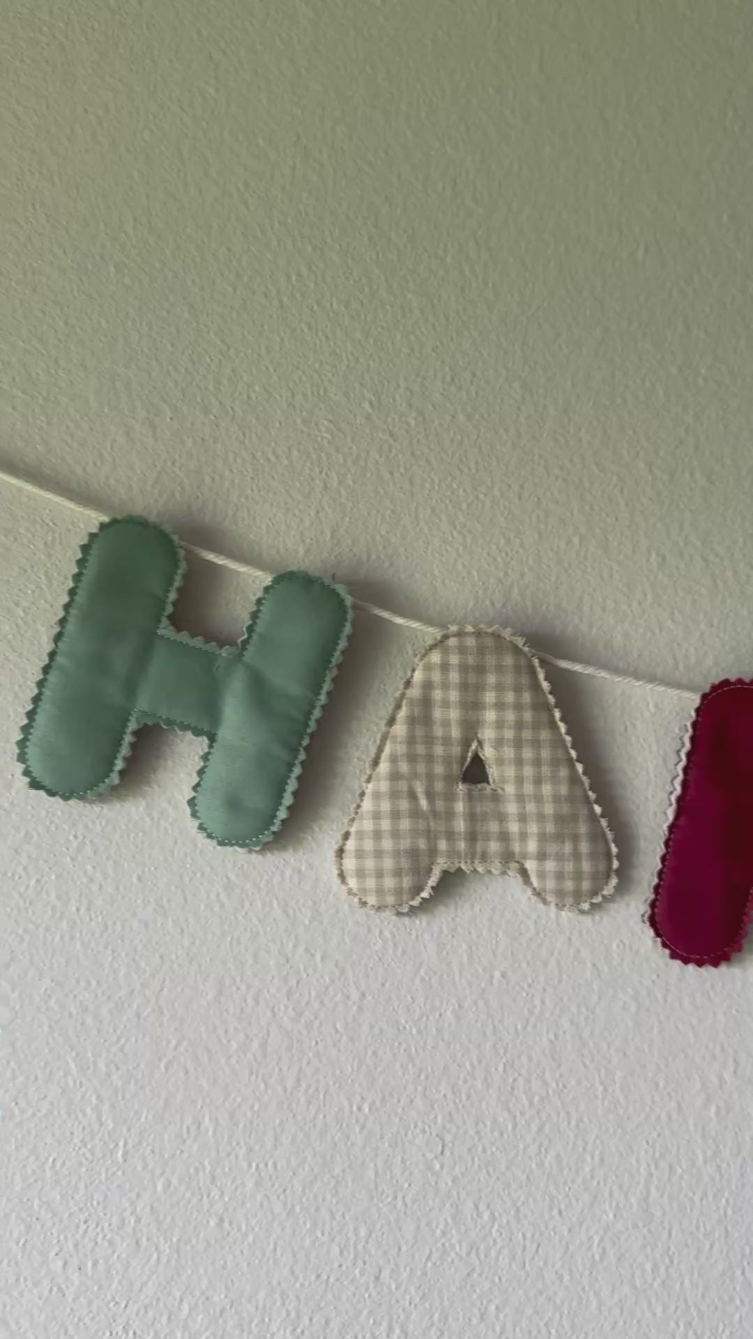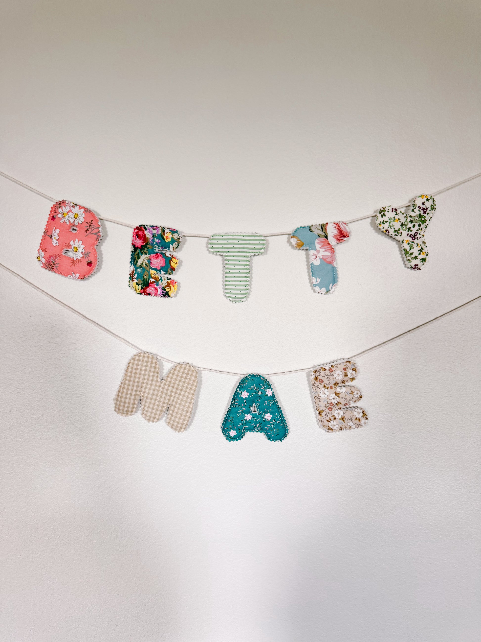 Letters are $7 each (minimum 3 letters) for up to 10 letters, $6.50 each for 11 or more letters. Letters will be sewn onto a cord for hanging.
